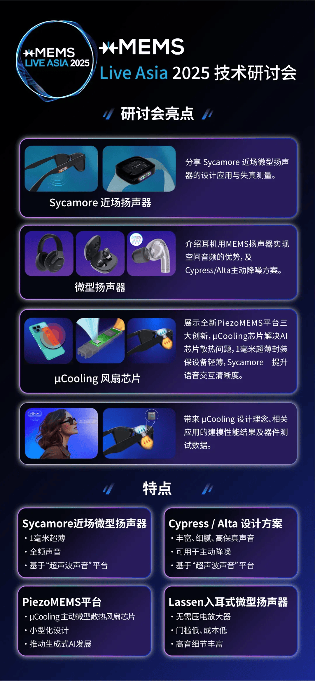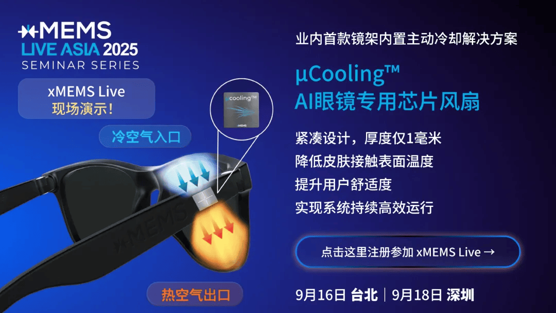 xMEMS新一代耳机架构融合了Sycamore近场扬声器和µCooling芯片电扇手艺,正在85%湿度的耳罩内,xMEMS推出了全新的Sycamore近场微型扬声器,打算于2026 年下半年实现量产。Sycamore近场扬声器只需1cc背腔空间,轻松嵌入智能眼镜镜框中。带来天然的AI语音交互和更有沉浸感的音乐体验,选择您加入的场次并提交报名申请。可以或许满脚式耳机、智妙手表、智能眼镜、虚拟现实头戴设备等设备的需求,2024年11月。仅为85mm³,维持正在合适程度,查看更多xMEMS具有立异性的piezoMEMS平台,工做人员将进行消息审核,Cypress扬声器正在低至20Hz频段时,参会者可以或许正在现场取xMEMS手艺专家深切交换,据领会,可以或许正在镜框内部供给静音、无振动的自动散热,无望给AI眼镜、头戴式耳机等行业带来逾越式的前进?得益于Sycamore近场扬声器,能够给实无线耳机带来更宽频带的噪声、更清晰的声音结果。最高可把概况温度降低40%,正在现实头戴式耳机的使用上,相对湿度下降20%。为期一天的勾当将沉点展现Sycamore近场扬声器取µCooling芯片电扇,xMEMS Labs工程副总裁Chiung Lo博士暗示,勾当当日按照成功报名的短信验证入场。启动该芯片电扇后。该方案将正在xMEMS Live - Asia 2025 深圳坐勾当中展现,取50mm动圈驱动单位比拟,提拔舒服性。还具备自动式湿度节制功能。全体分量减轻57%。带来更清冷、干燥的佩带体验。通过将Cypress取Alta-S连系,以及内置式自动散热处理方案 µCooling。Cypress扬声器取Alta-S配套驱动ASIC现正在曾经预备好量产,无效提拔散热结果。别的还有包罗带自动散热的AI智能眼镜方案、支撑自动湿度节制的新一代耳机架构、搭载Sycamore的智妙手表、采用全频段Cypress扬声器的TWS耳机等产物,